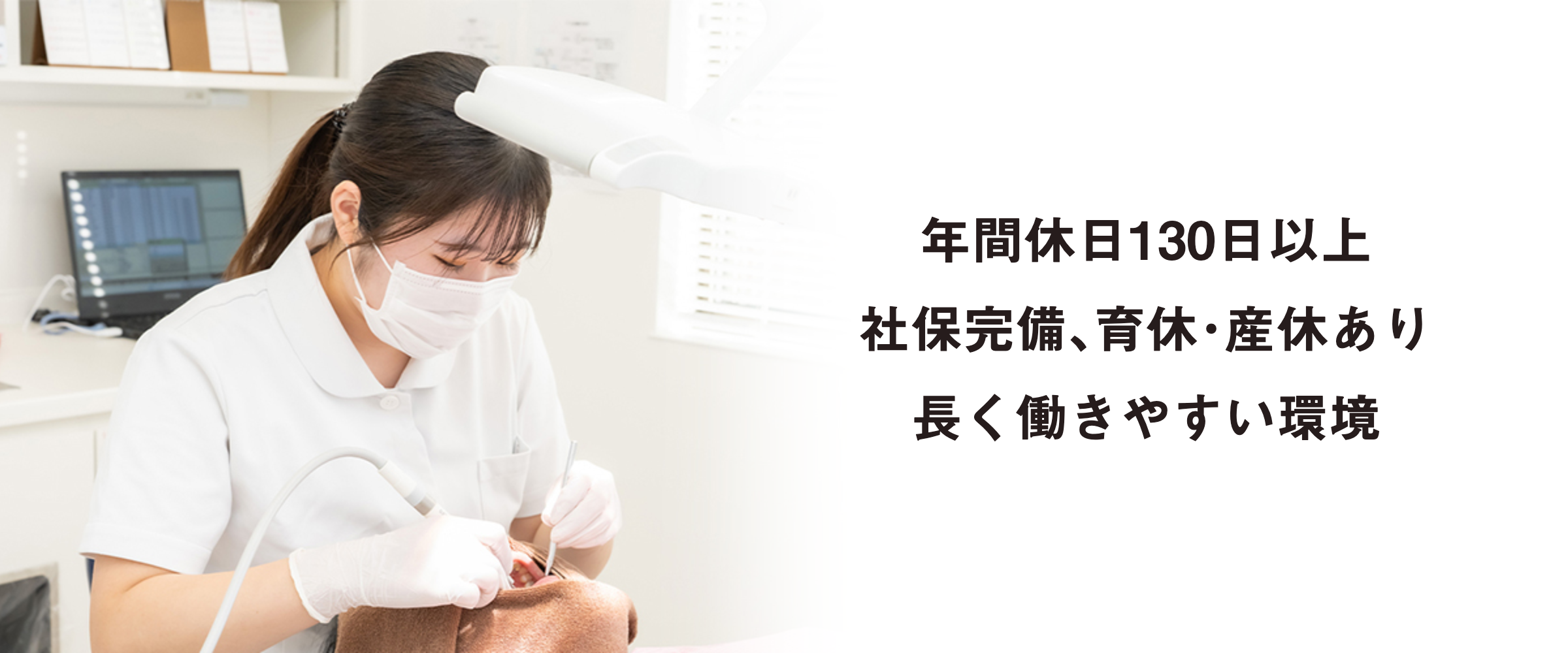 社保完備の上、年間休日は130日。産休・育休もあり働きやすい歯科医院です。